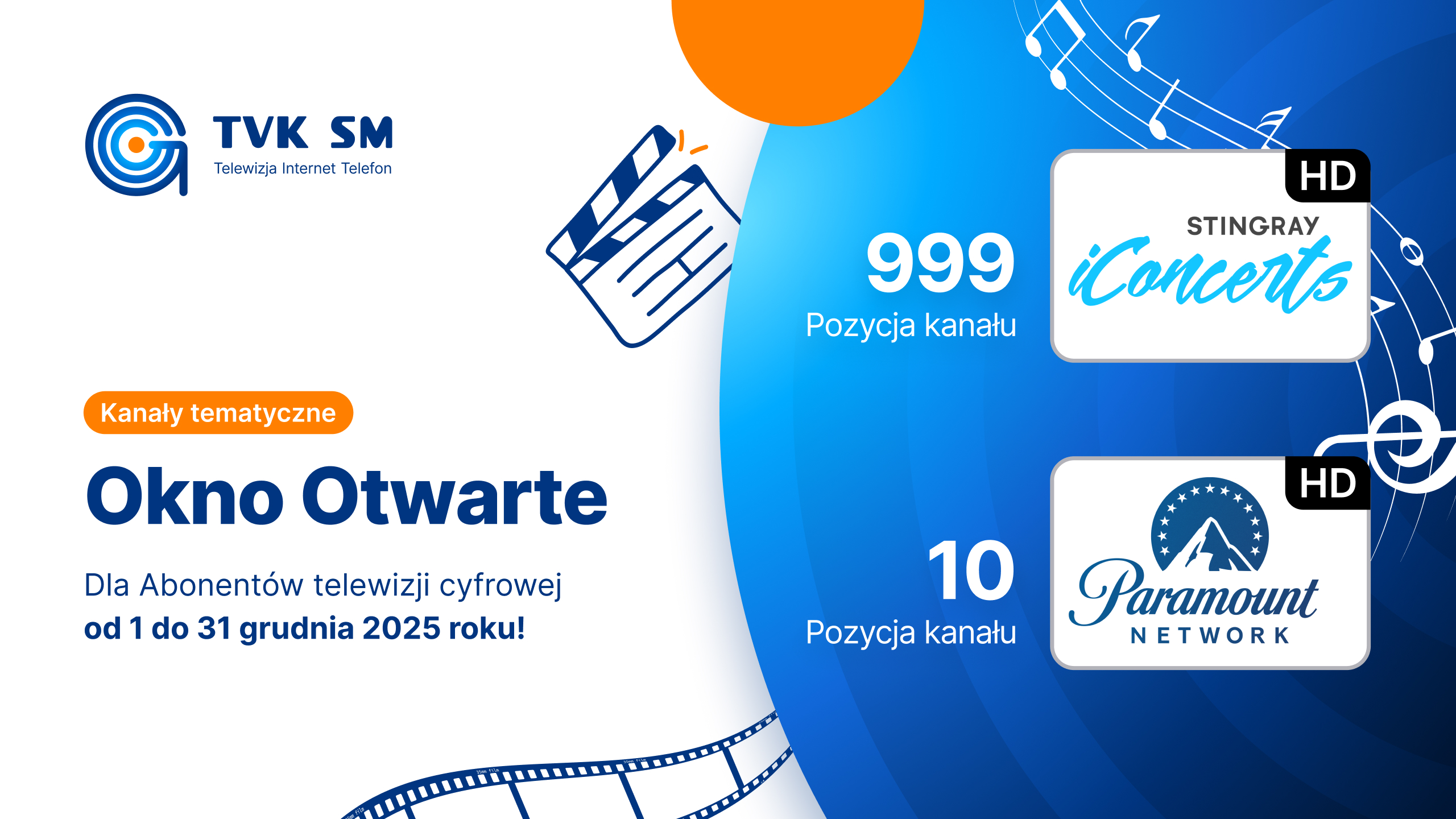 Mamy przyjemność poinformować, że od 1 do 31 grudnia 2025 roku kanały Stingray iConcerts HD (pozycja 999) oraz Paramount Network HD (pozycja 10) będą dostępne bezpłatnie w ramach Okna Otwartego dla wszystkich Abonentów TV cyfrowej!