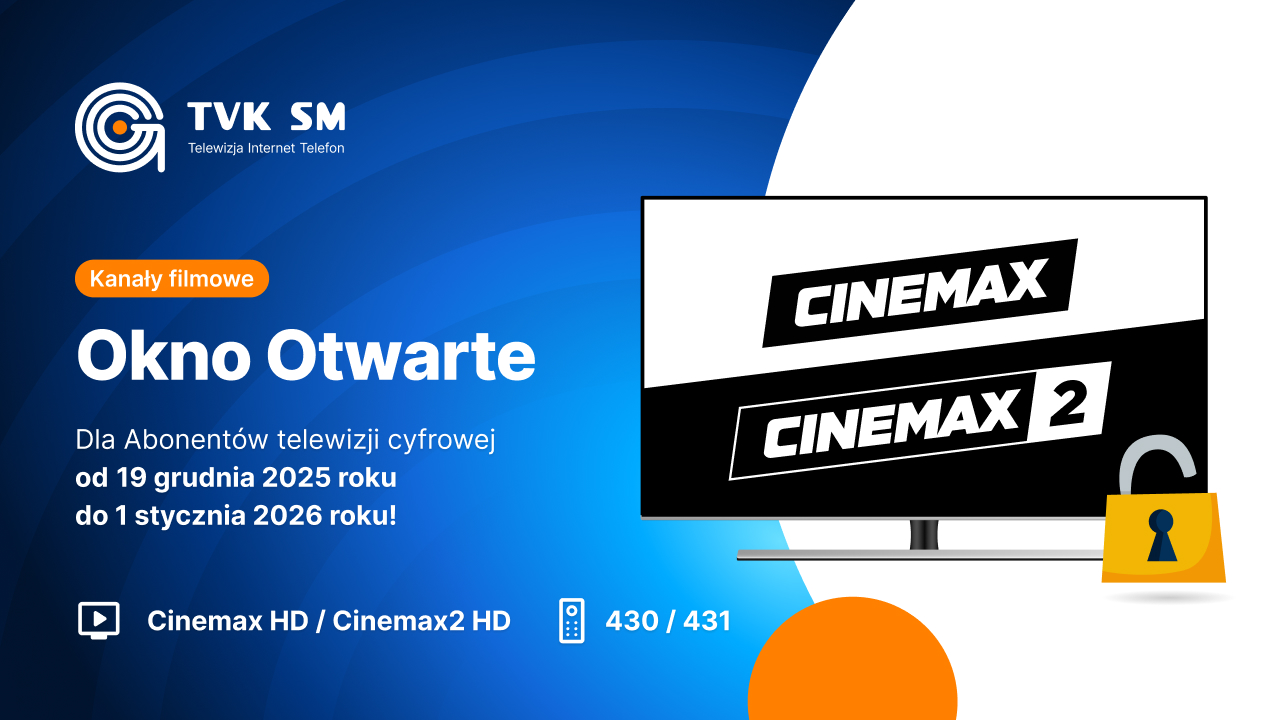 Informujemy, że od 19 grudnia 2025 roku do 1 stycznia 2026 roku kanały Cinemax HD (pozycja 430) oraz Cinemax2 HD (pozycja 431) będą dostępne bezpłatnie w ramach Okna Otwartego dla wszystkich Abonentów TV cyfrowej!