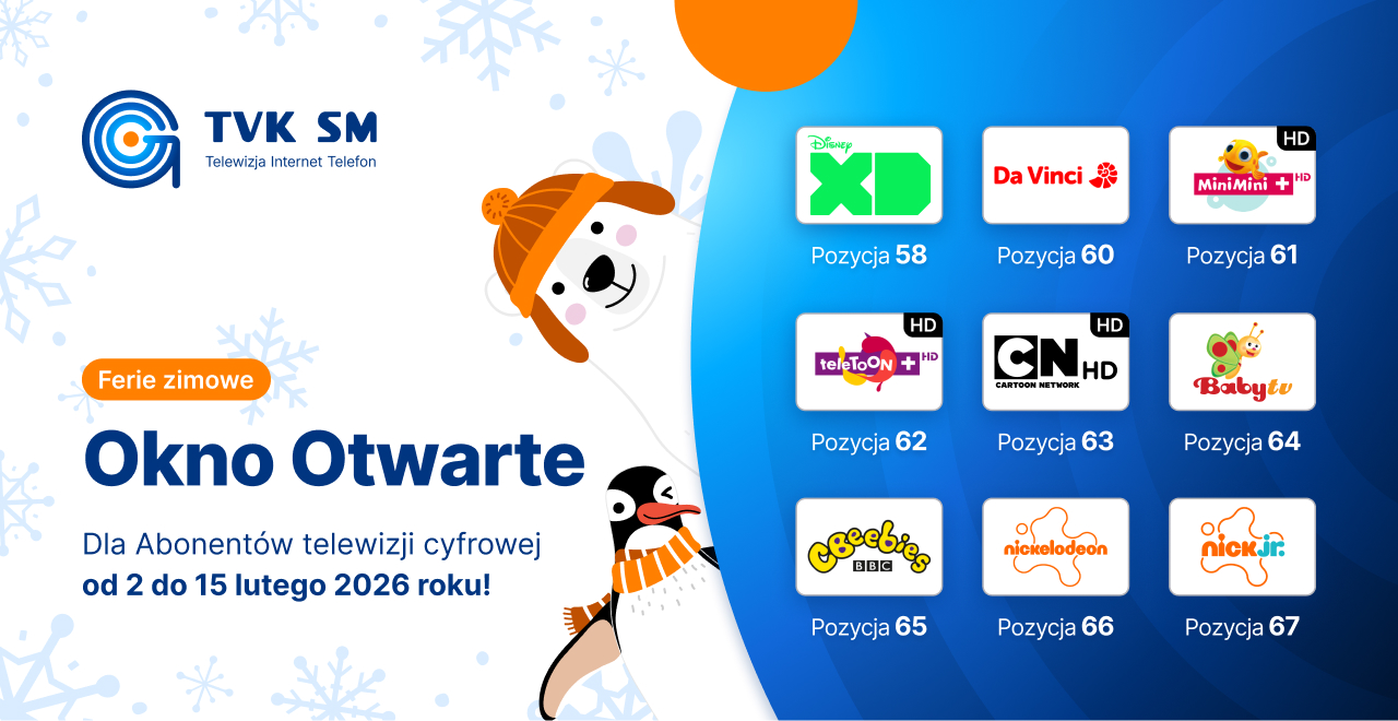 Na okres ferii zimowych od 2 do 15 lutego 2026 roku dla naszych najmłodszych widzów przygotowaliśmy wspólnie z nadawcami okna otwarte z kanałami dziecięcymi. Aż dziewięć kanałów odkodujemy gratis dla wszystkich Abonentów telewizji cyfrowej, którzy na co dzień nie mają do nich dostępu!