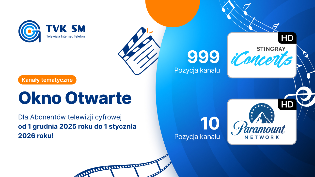 Mamy przyjemność poinformować, że od 1 grudnia 2025 roku do 1 stycznia 2026 roku kanały Stingray iConcerts HD (pozycja 999) oraz Paramount Network HD (pozycja 10) będą dostępne bezpłatnie w ramach Okna Otwartego dla wszystkich Abonentów TV cyfrowej!